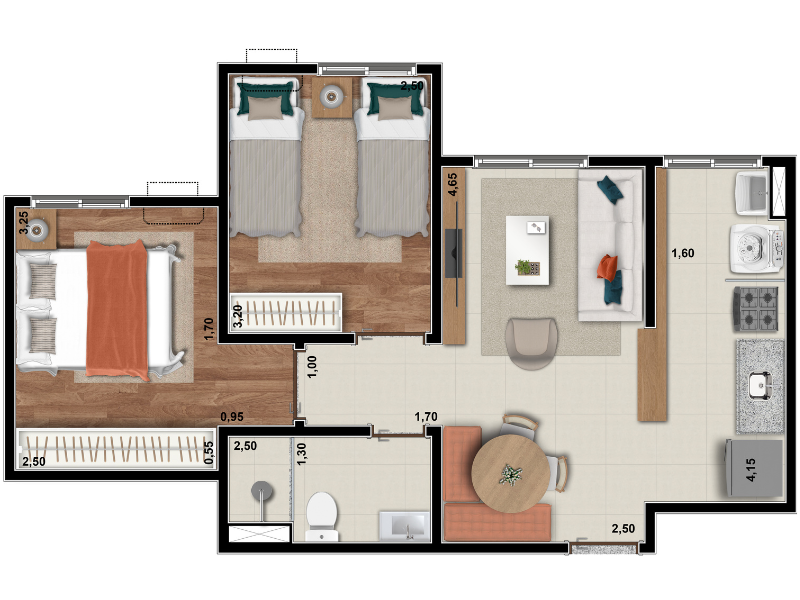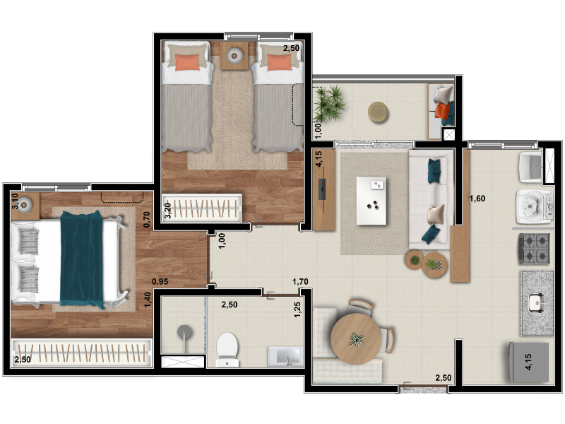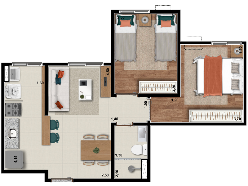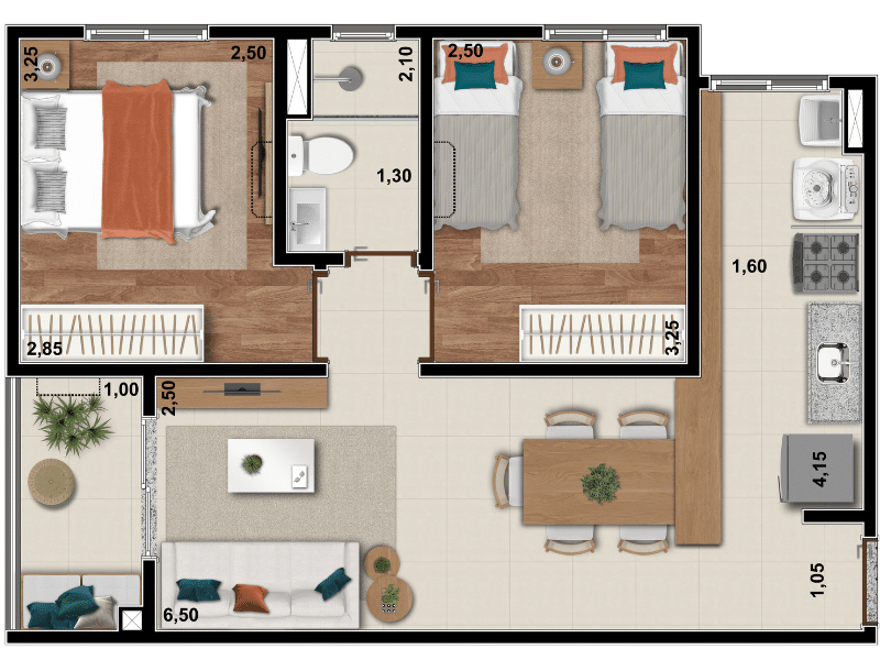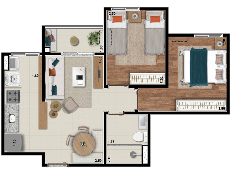 Com tipologias que variam de 45 a 80 metros quadrados, o Altanere oferece diversas opções de plantas com dois dormitórios, algumas com varanda e outras com garden privativo. As unidades foram desenhadas para aproveitar ao máximo a integração entre os ambientes, contando com sala de estar e jantar em conceito aberto, cozinha funcional com bancadas em granito, quartos confortáveis, banheiro moderno com ventilação mecânica e preparação para ar-condicionado tipo split nos dormitórios. Além disso, o acabamento inclui piso laminado nos dormitórios (exceto nas unidades térreas), esquadrias de alumínio na cor branca e portas com vedação acústica, reforçando a sensação de bem-estar.